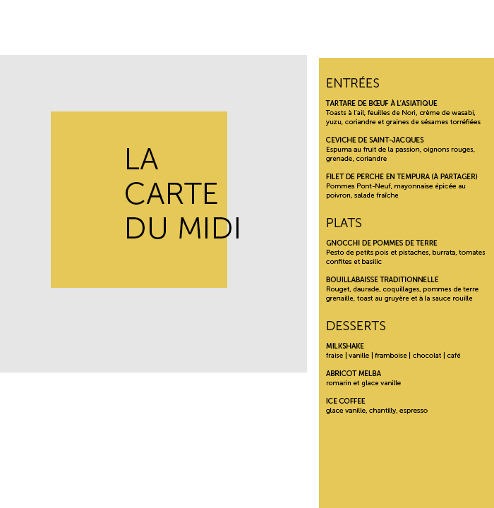1 entrée + 1 plat ou 1 plat + 1 dessert | CHF 35.00